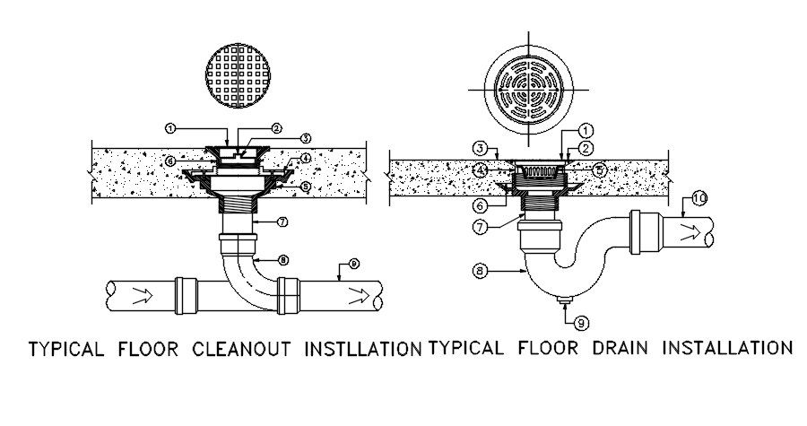 The typical floor clean out instillation and drain installation detail with the top and side section view that provide internal drainage of water from the roof surface with connected PVC pipe line. this types of roof drains are suitable for many installations. Thank you for downloading the AutoCAD 2D DWG drawing file and other CAD program files from our website.