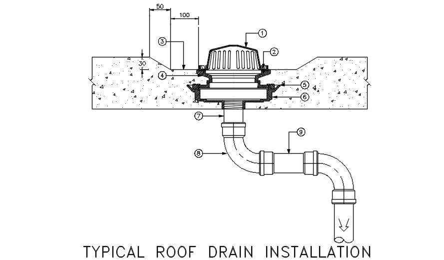 the typical roof drain instillation section drawing that shows cast iron and brass bronze body, also its drain rain water with flashing flange dome. its plastic mushroom dome and bottom outlet. Thank you for downloading the AutoCAD 2D DWG drawing file and other CAD program files from our website.