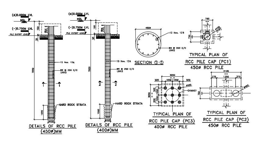 Detail of the RCC pile cap drawing presented in this Autocad drawing file. this file consists of RCC pile cap detail, footing detail, section detail of RCC pile cap with dimensions and material specifications presented. this can be used by architects and engineers. Download this 2d AutoCAD drawing file.