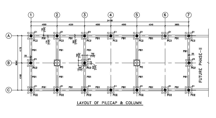 The layout of the pile cap and column detail is given in this AutoCAD drawing file.Download this 2d AutoCAD drawing file.