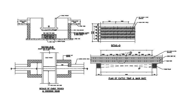 Plan of cattle trap and main gate detail provided in this AutoCAD drawing file. Download this 2d AutoCAD drawing file.