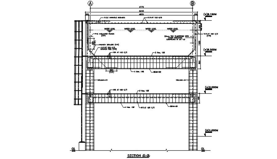 Beam, Column, and slab section details at the pump house are provided in this AutoCAD DWG file. The files consist of the Beam-Column, and slab layout of the pump house with clear dimensions and material specifications. The water level also mentioned in this drawing. This drawing file is useful for structural and civil engineers. Download this 2d Autocad drawing file.