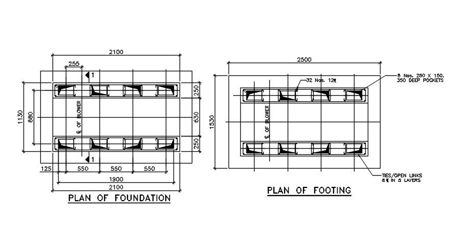 The plan of foundation and footing section detail is provided in this AutoCAD drawing file. The files contain the plan of foundation and footing with dimensions. This drawing file is useful for structural and civil engineers. Download this 2d Autocad drawing file.