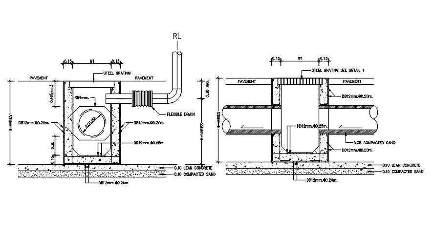 The drainage chamber box CAD drawing which consist top over steel grating, flexible drainage pile line, lean concrete level and pavement detail that shows front and side view drawing. Thank you for downloading the AutoCAD file and other CAD program from our website.