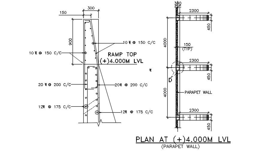 Section detail of the parapet wall separated in this Autocad drawing file. this file consists of a steel bar detail and detailed drawing with dimensions and material specification details. this can be used by architects and engineers. Download this 2d Autocad drawing file.
