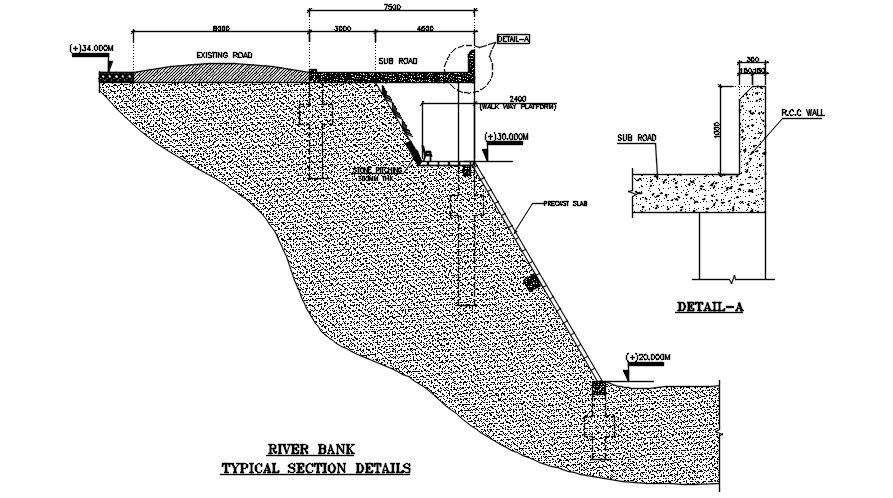Riverbank's typical section detail provided in this AutoCAD drawing file. Download this 2d Autocad drawing file.
