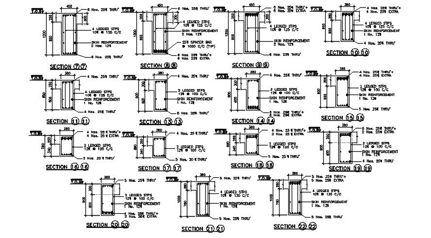 Main plant Different section view of beam has given in this 2D Autocad WG drawing file. Each section has the different sizes and mentioned in the drawing file. No of bars, size of bars, reinforcement details, length and breadth is mentioned in this model and layout. Thank you for downloading the 2D Autocad DWG drawing file and other CAD program files from our cadbull website.