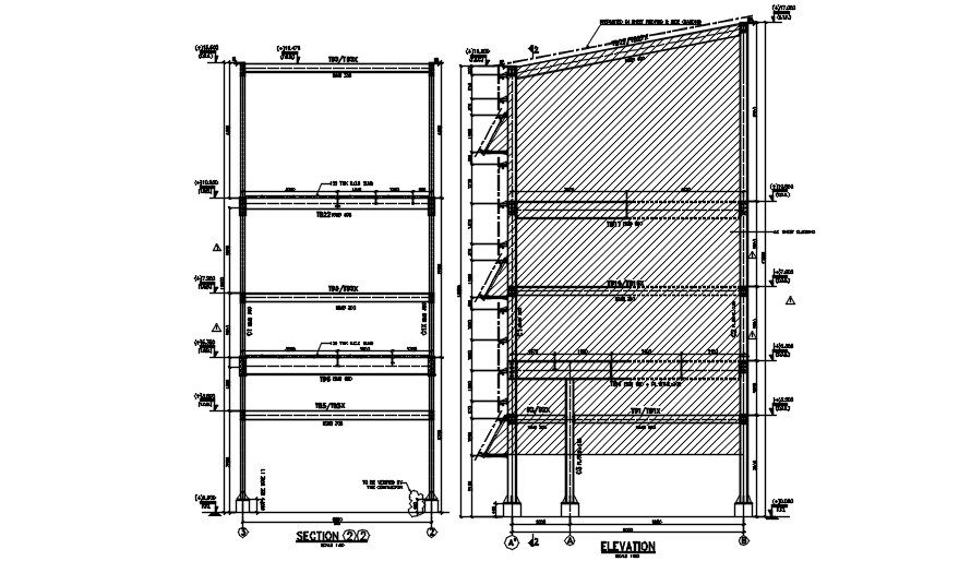 A section and elevation of main plant detail of shed is given in this 2D Autocad DWG drawing file. RCC slab thickness is 125mm for each floor. Pre painted GI sheet roofing and side cladding is provided in this model. Different channel section details are mentioned in this drawing file. Thank you for downloading the 2D Autocad DWG drawing file and other CAD program files from our cadbull website.