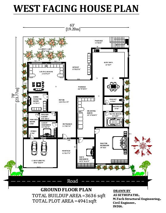 63'X78' West facing 3bhk Luxury house plan as per Vastu Shastra. The total Buildup area of this house drawing is 3636 sqft. And the total plot area is 4941 sqft. The Master bedroom is in the southwest direction. The kid's bedroom is in the west. The common toilet with a bathtub is placed in the south direction. The guest bedroom is in the west. The drawing room is placed in the west near the kid's bedroom. the kitchen is placed in the southeast. dining near the kitchen is in the south. Home theater room is placed in the north. The powder room is in the north.walkin closet is in the north near the powder room. The storeroom is in the north near the car parking. The hall is available in the center of the house. The storeroom is in the northwest. The living room is in the northeast. The staircase placed in the southeast direction outside of the house.portico is in the west. The Garden area is in the northeast. Download Autocad DWG and PDF files.