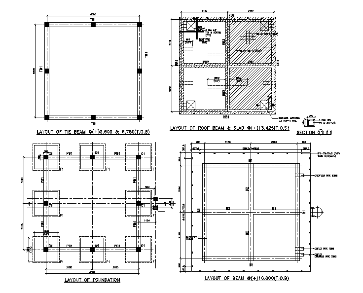 Layout of tie beam and slab of drive bed foundation has given in this Autocad DWG drawing file. Layout of beam and roof is 8x8m. Layout of tie beam is 6.3x6.3m. Section details also given in this drawing model and layout. Thank you for downloading the AutoCAD file and other CAD program files from our website.
