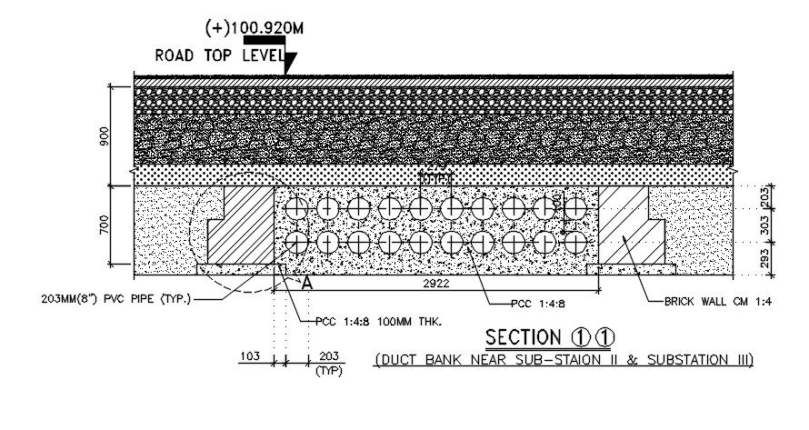 Typical sectional details of Electrical Duct bank is described. Electrical Duct bank are laid out within PVC conduits that are bundled together, these groupings of conduit are protected by concrete casings. In this section material specification, PVC pipe cross sectional dimensions and base course and sub course below road level of the duct are specified. Download the AutoCAD DWG file form our website for enhanced view.