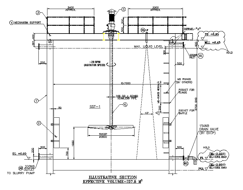 7m dia and 6.7m height of sludge storage tank general arrangement details has given in this 2D Autocad DWG drawing file. Illustrate section effective volume of 258m3, plan view, anchor pocket details, agitator base frame fixing details and channel section details are given clearly in this drawing model and layout. Thank you for downloading the AutoCAD file and other CAD program files from our website.