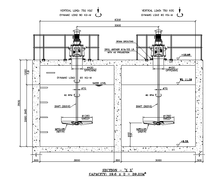 Section view of sludge storage and capacity details has given in this 2D Autocad DWG drawing file. Impellor, shaft, dynamic load, water level, drill anchor with projection, 50mm grouting and measurements are given in this drawing model and layout. Thank you for downloading the AutoCAD file and other CAD program files from our website.