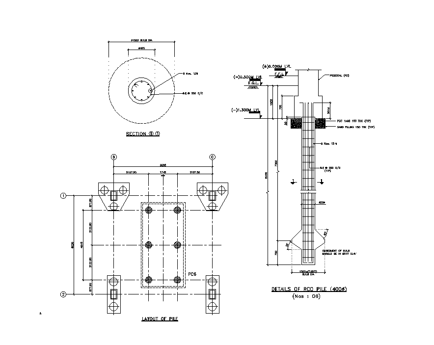 Layout and details of RCC pile of bagasse elevator has given in this 2D Autocad DWG drawing file. Thickness of PCC and sand filling is 150mm. Pedestal is provided. Other details are given in this drawing model. Download the 2D Autocad DWG drawing file. Thank you for downloading the 2D Autocad file and other CAD program files from our website.