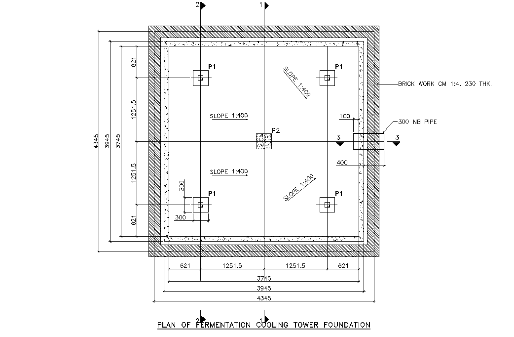 Plan of fermentation cooling tower foundation details has provided in this 2D Autocad DWG drawing file. Thickness of brick wall is 230mm. slope is 1:400. 300mm NB pipe is provided in this cooling tower. Foundations are mentioned in this drawing file. Download the 2D Autocad DWG drawing file. Thank you for downloading the 2D Autocad file and other CAD program files from our website.