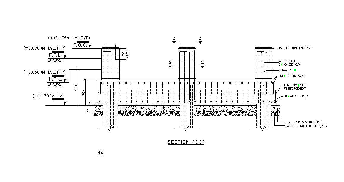 Section details of pile cap and pedestal for equipment foundation has given in this 2D Autocad DWG drawing file. Thickness of sand filling and PCC is 150mm. 1 no of 12mm diameter skin reinforcement is provided. 25mm thickness of grouting is provided. Thank you for downloading the 2D Autocad file and other CAD program files from our website.
