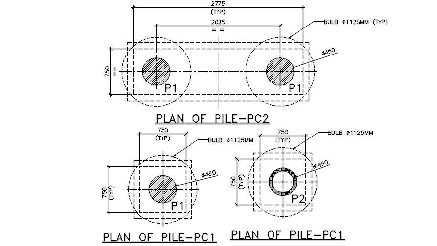 Plan of pile detail drawing separated in this Autocad drawing file. this file consists of pc1 and pc2 pile cap details given with dimensions and material specification. this file can be used by architects engineers and engineers. Download this 2d AutoCAD drawing file.
