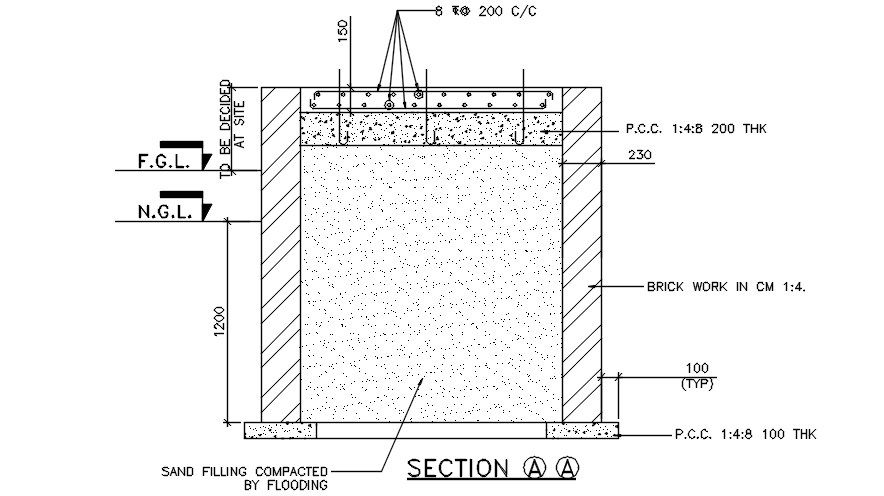 Footing detail of reinforcement drawing provided in this Autocad file. in this file sand filling detail, PCC detail, brickwork detail given with dimensions and specifications. this file can be used by architects engineers and engineers. Download this 2d Autocad drawing file.