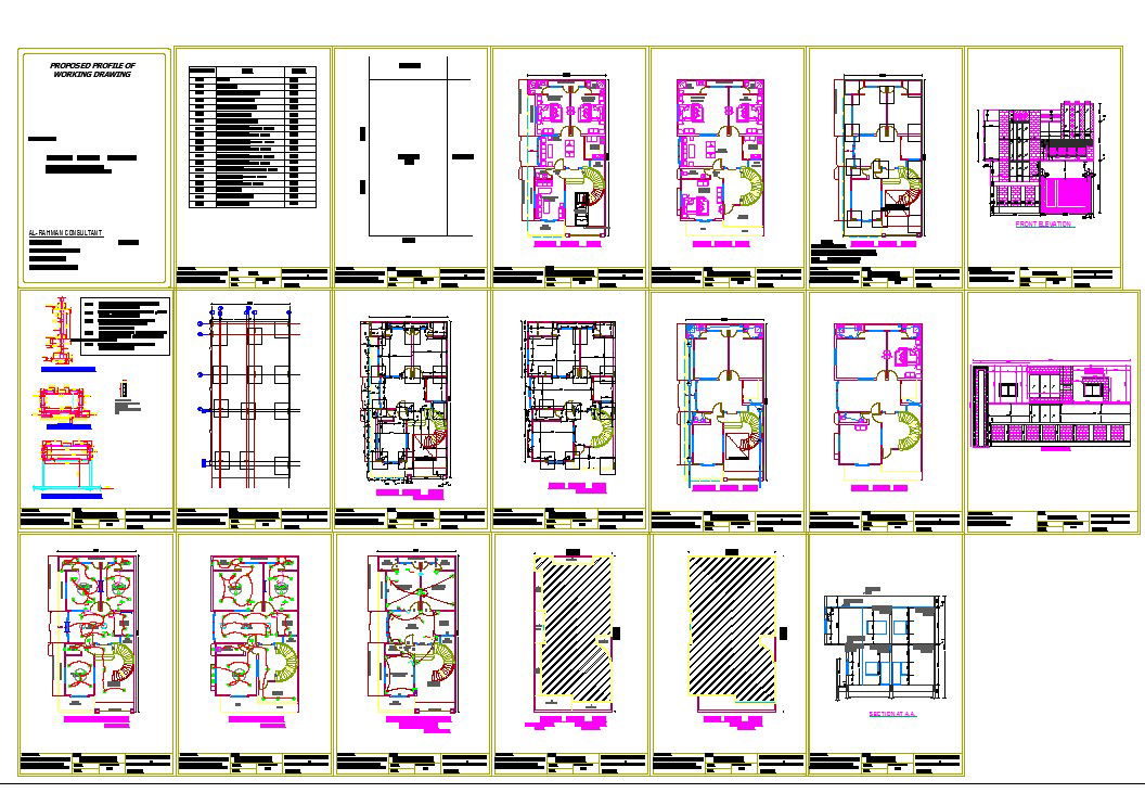 Modern architecture house design and detail with presentaions plan, working plan, sections, elevations, electrical detail, furniture detail, plumbing detail and structure detail cad files.