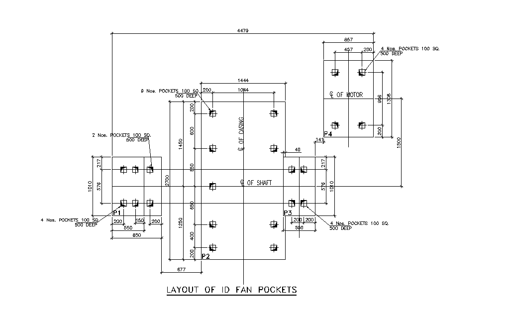 Layout of ID fan pockets details are given in this 2D Autocad DWG drawing file. 2,4 and 9 nos of deep pocket is mentioned in this drawing file. Measurements are given for each footing distance and footing. Other details are given in this drawing model. Thank you for downloading the 2D Autocad file and other CAD program files from our website.