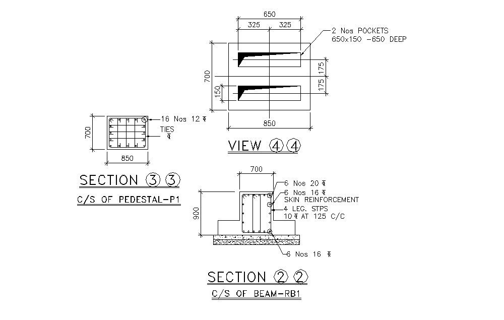 Cross section of pedestal and beam details are given in this 2D Autocad DWG drawing file. 6 nos of 16mm dia of skin reinforcement is provided. 2 nos of deep pockets are specified in this drawing file. Reinforcement details are given in the drawing model. Thank you for downloading the 2D Autocad file and other CAD program files from our website.
