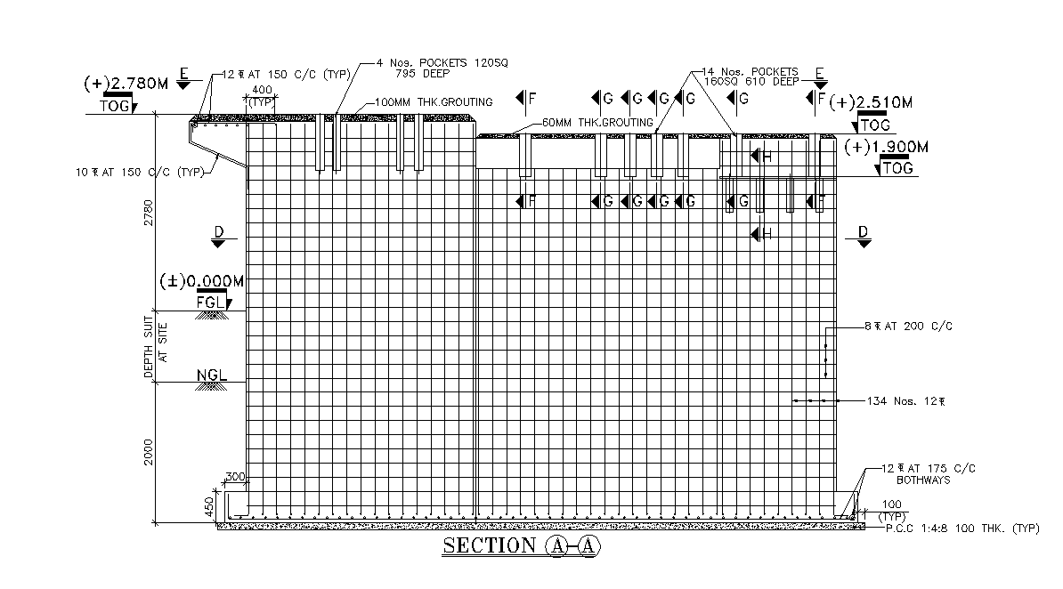 Layout and foundation section details are given in this AutoCAD 2D DWG drawing file. Thickness of sand filling and grouting is 100mm and 100 respectively. 4 and 14 nos of deep pockets are used with size of 120sqx795 and 160sqx610 respectively. Reinforcement details are given in the model. Download the 2D AutoCAD DWG drawing file. Thank you for download the 2D AutoCAD DWG drawing file and other CAD program files from our website.