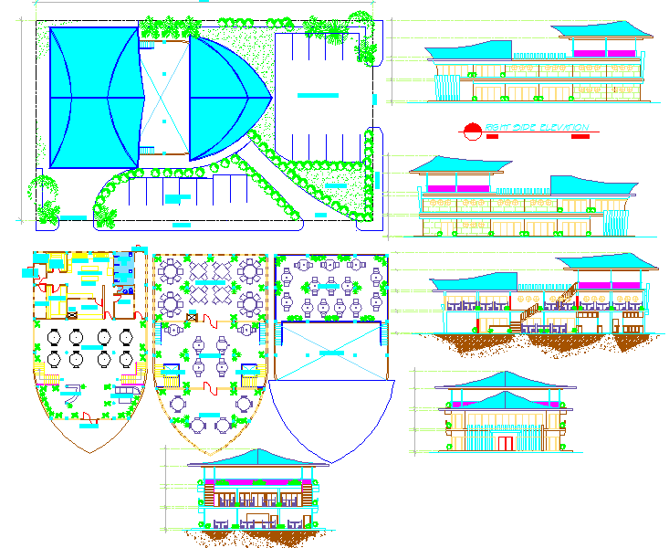 Restaurant detail in all design like plan lay-out, garden seating table area, dining area, With Elevation & section detail.