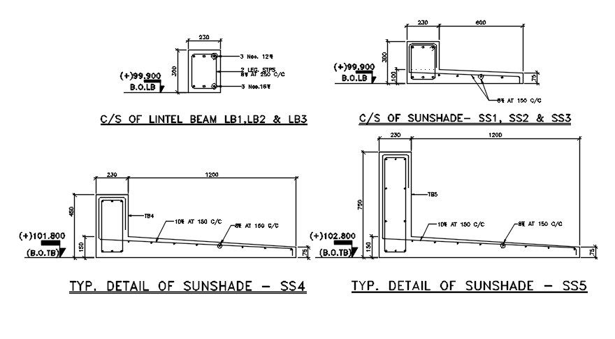 Detail of sunshade for the lintel beam specified in this AutoCAD file. in this file, reinforcement detail, steel bar detail with dimensions and material specification clearly shown in this cad drawing file.this can be used by architects and engineers. Download this 2d AutoCAD drawing file.
