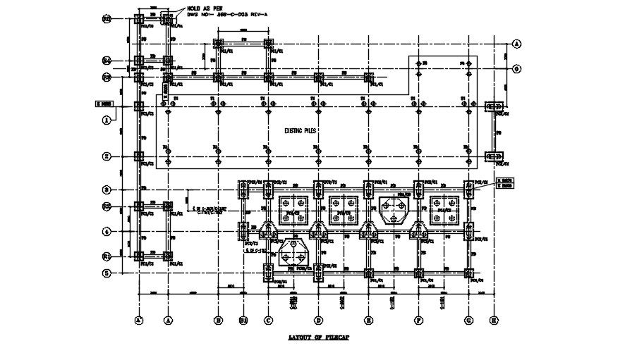 The layout of the pile cap detail drawing stated in this Autocad file. Download this 2d AutoCAD drawing file.