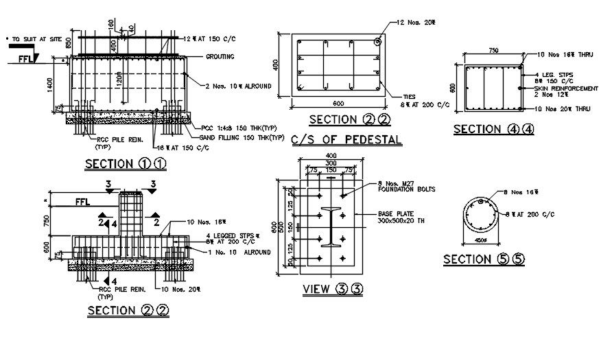 Section detail of reinforcement detail drawing provided in this Autocad file. this file circular, square, rectangular section detail of reinforcement given with dimensions and material specification clearly shown in this cad drawing file.this can be used by architects and engineers. Download this 2d Autocad drawing file.