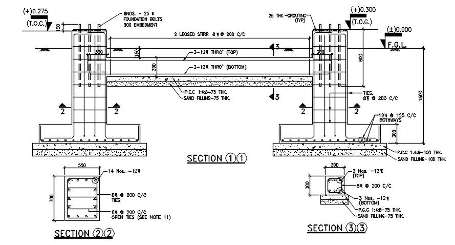Footing detail drawing specified in this Autocad file. this file section detail of reinforcement for footing given with dimensions and material specification clearly shown in this cad drawing file.this can be used by architects and engineers. Download this 2d Autocad drawing file.