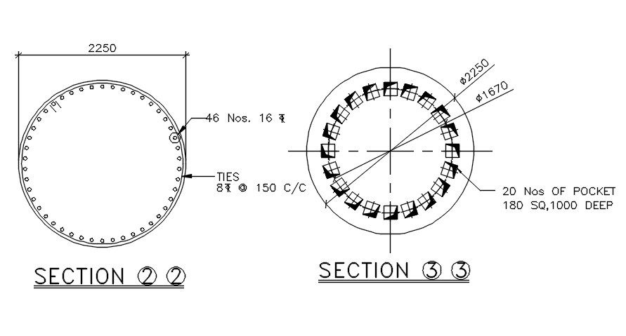 Circular foundation detail drawing specified in this Autocad file. this file consists of steel bar detail and section detail of column detail given with dimensions, and material specification clearly shown in this cad drawing file.this can be used by architects and engineers. Download this 2d Autocad drawing file.