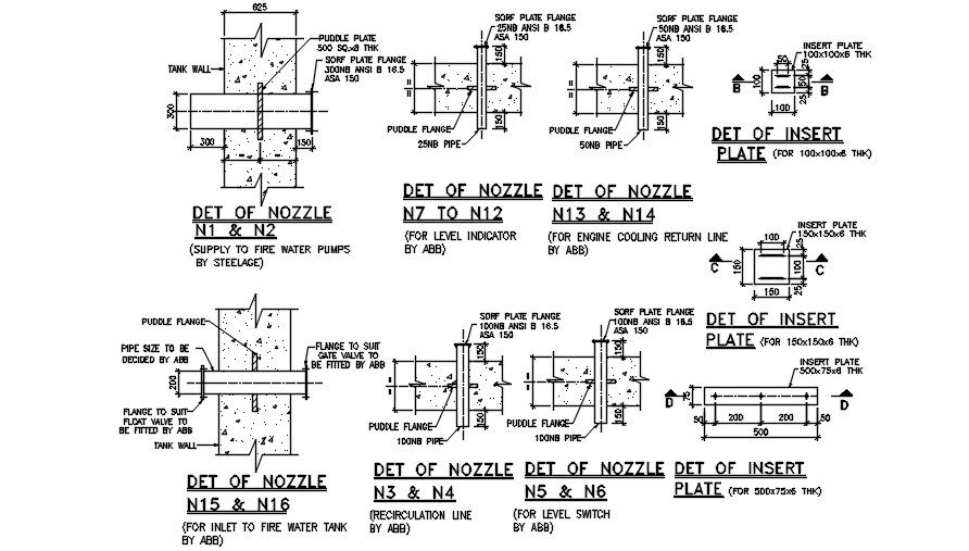 Nozzle detail drawing provided in this Autocad drawing file. in this file, detail of the insert plate and structural detail given with dimensions detail andspecifications.given in it. This can be used by architects engineers and engineers. Download this 2d AutoCAD drawing file.