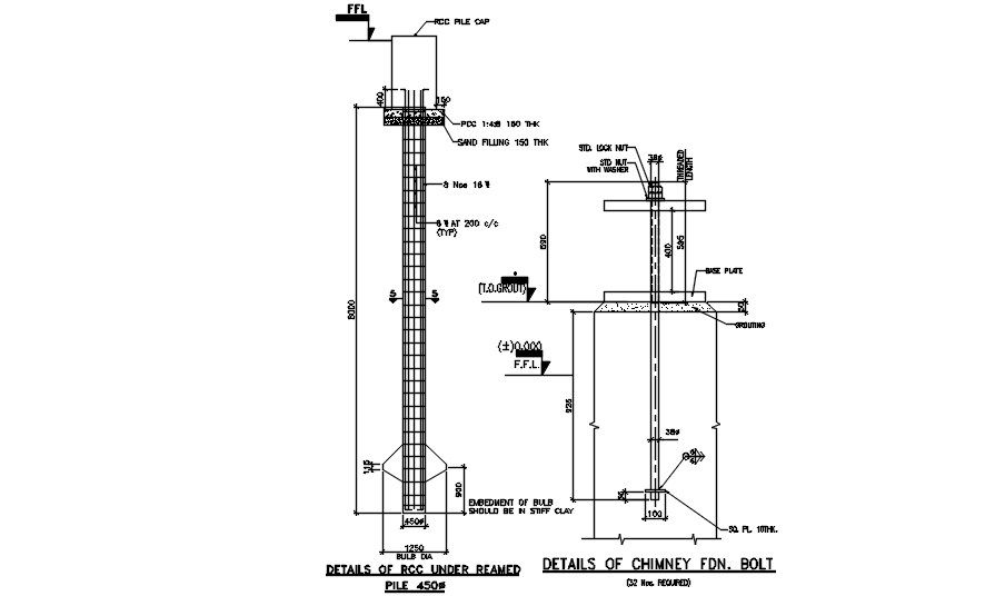 Detail of chimney foundation bolt specified in this Autocad file. this file consists of RCC pile detail with dimensions detail and specifications.given in it. This can be used by architects engineers and engineers. Download this 2d Autocad drawing file.