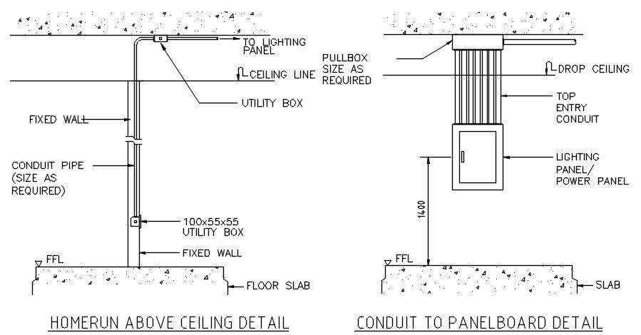 Conduit to panelboard detail drawing provided in this Autocad file. this file consists of homerun above ceiling details presented in this AutoCAD drawing file. this can be used by civil engineers and engineers. Download this 2d Autocad drawing file.