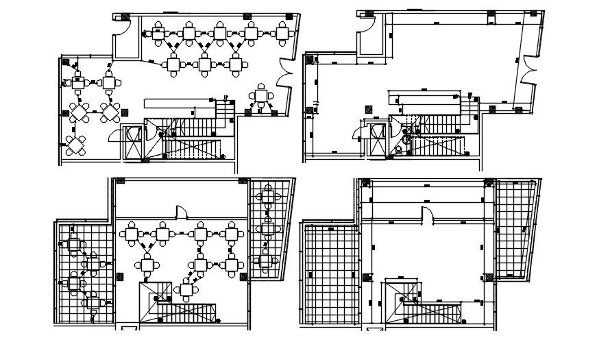 Restaurant floor plan detail drawing specified in this Autocad file. this file consists of four different floor plans with a dining hall, ground floor, terrace plan. also, staircase detail is given with specifications. this can be used by civil engineers and engineers. Download this 2d Autocad drawing file.