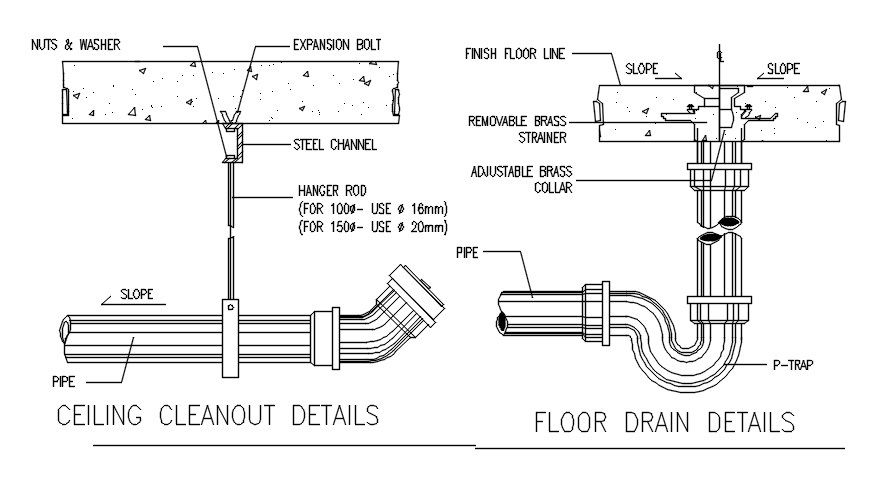 Ceiling cleanout details stated in this Autocad file. this file consists of floor drain details and slops details, hunger road detail with dimensions, and specifications. this can be used by civil engineers and engineers. Download this 2d Autocad drawing file.