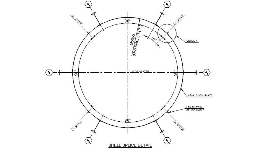 Shell splice detail is given in this 2D Autocad DWG drawing file. Thickness of shell plate is 6mm. splice angle size is L75x75x6mm. CL splice is mentioned in this model. Diameter of the shell is 5m. Download the 2D Autocad DWG drawing file. Thank you for downloading 2D AutoCAD DWG drawing file and other CAD program files from our website.