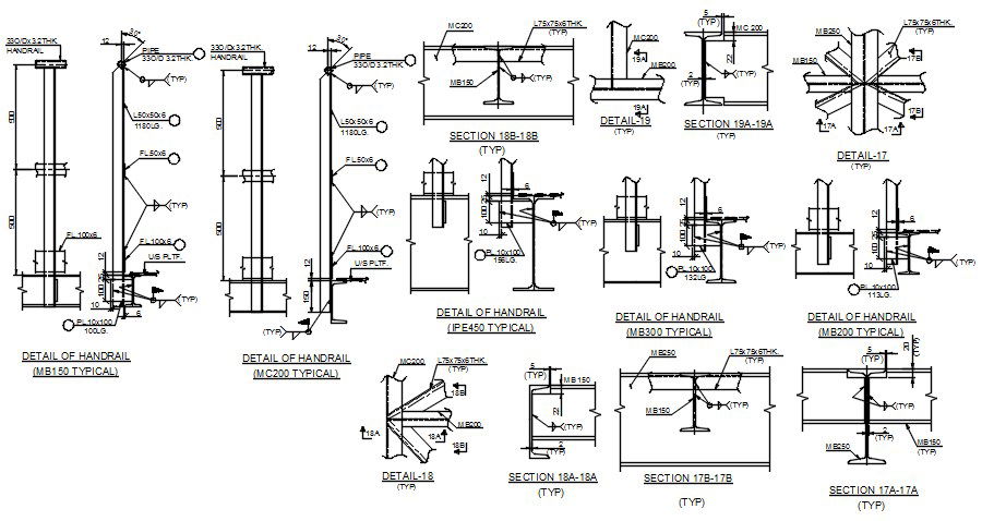 Autocad 2D DWG drawing file has the details of handrails and sections. The details are given for each sections like IPE450, MB 300 and MB 200. MC 200 section also used in this handrail. Size of the angle section is 75x75x6mm thickness. Thank you for downloading 2D AutoCAD DWG drawing file and other CAD program files from our website.