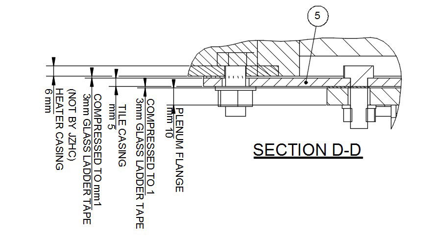 Section view of the fly ash plant part details has given in this 2D Autocad DWG drawing file. Plenum flange thickness is 10mm. Tile casing, heater casing, compressed to 1 and 3mm thickness of glass ladder tape are mentioned in this drawing model. Thickness of tile casing and heater casing is 5mm and 6mm respectively. Thank you for downloading 2D AutoCAD DWG drawing file and other CAD program files from our website.