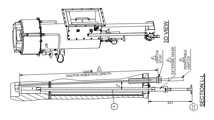 Section and 3D view of the ignitor insertion length details are given in this 2D AutoCAD DWG drawing file. The length of ignitor insertion is 1400mm. External mixer, ignitor stop and removable ignitor is mentioned. Download the 2D AutoCAD file. Thank you for downloading 2D AutoCAD DWG drawing file and other CAD program files from our website.