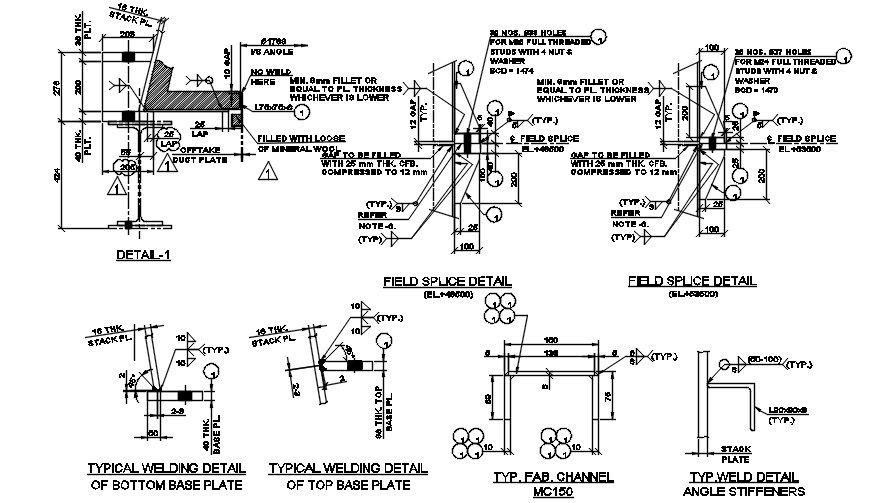 Typical welding detail of bottom base plate details is given in this 2D Autocad DWG drawing file. Thickness of top base plate is 36mm. Thickness of bottom base plate is 40mm. Typical fabricated channel section details are given in this model. Field splice details are given in this file. Download the 2D Autocad DWG drawing file. Thank you for downloading the 2D Autocad file and other CAD program files from our website.