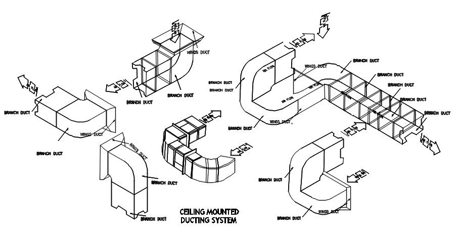 The ceiling-mounted ducting system specified in this AutoCAD file.  Download this 2d AutoCAD drawing file.