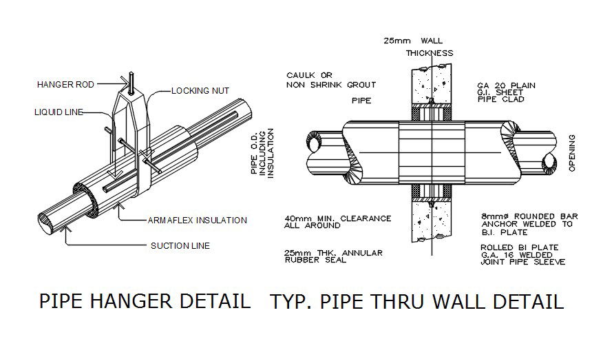 Pipe hanger detail drawing presented in this AutoCAD file. in this file, pipe thru wall detail and pipe detail drawing with dimensions and specification details given in it. this can be used by architects and engineers. Download this 2d AutoCAD drawing file.