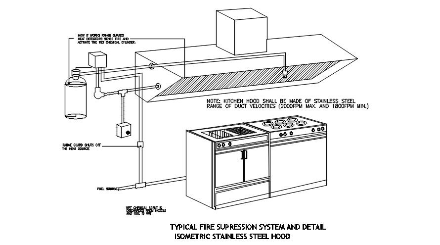 Typical fire suppression system and detail isometric stainless steel hood details is given in this AutoCAD drawing file. Download this 2d AutoCAD drawing file.