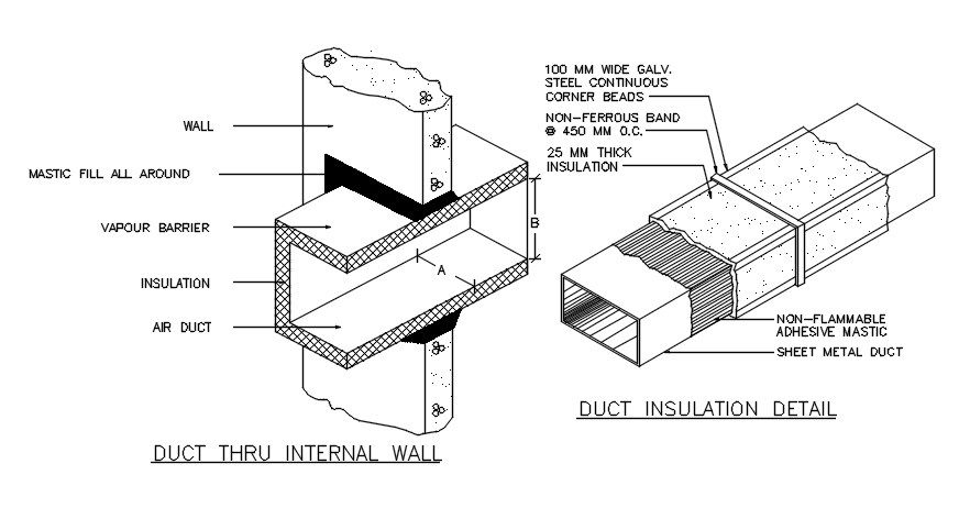 Duct thru internal wall detail is given in this 2D AutoCAD DWG drawing file. Download the 2D Autocad DWG drawing file.