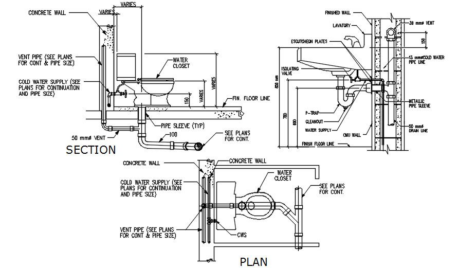 The toilet working drawing detail stated in this AutoCAD file. this file consists of, plan, elevation, and section detail with water closet and see plans for cont. pipe sleeve detail drawing given in this file. this can be used by architects and engineers. Download this 2d AutoCAD drawing file.