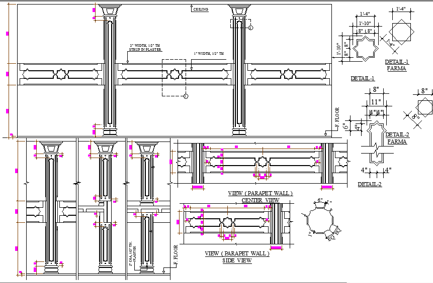 Column All Cutting Section Detail Parapet wall, centre ciew, first floor side view, center cutting detail. strup in plaster.