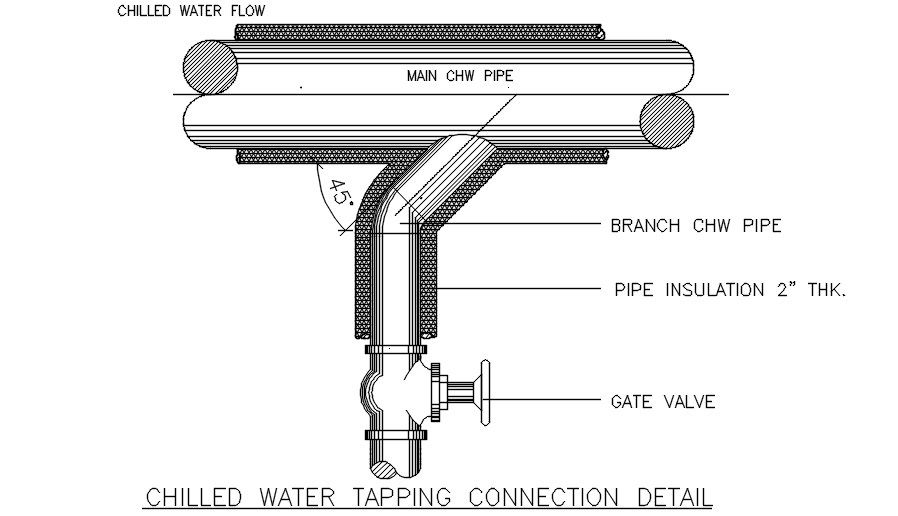 Chilled water tapping connection details are given in this 2D AutoCAD DWG drawing file.  Download the Autocad DWG drawing file.