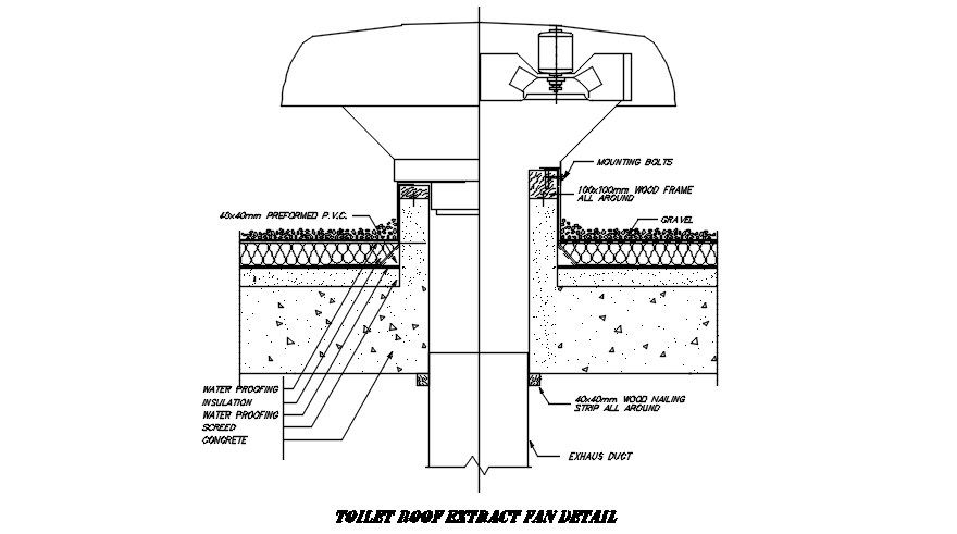 Toilet roof extract fan detail is given in this 2D AutoCAD DWG drawing file. 40x40mm wood nailing strip around the roof, exhaust duct, mounting bolts, gravel, 100x100mm wood frame, water proofing insulation, screed concrete and 40x40mm performed PVC are mentioned in this drawing file. Download the 2D AutoCAD DWG drawing file. Thank you for downloading 2D AutoCAD DWG drawing file and other CAD program files from our website.